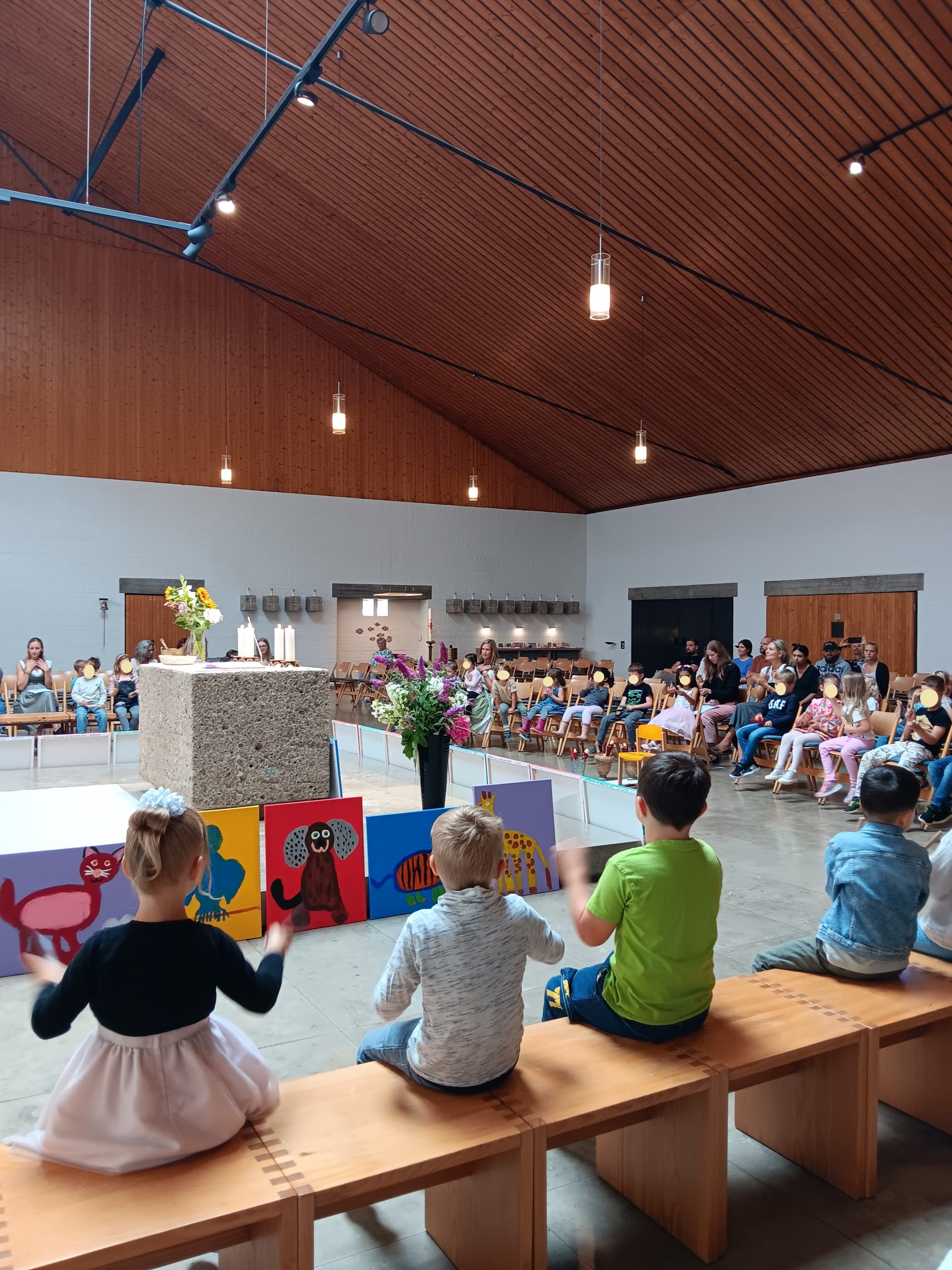 Mit dem 25. Juli begann für die Vorschulkinder aus dem Haus für Kinder Sonnenschein – sowie deren Eltern – ein neuer Lebensabschnitt voller Abenteuer, spannender Erfahrungen und Wissen. Denn jetzt sind sie keine Kindergartenkinder mehr. Vor dem “Rauswurf” fand aber noch die große Schulranzen-Party statt. Dabei zeigten alle Vorschülerinnen und Vorschüler voller Stolz ihre Schultaschen beim Morgenkreis. Danach wurde gemütlich zusammen gefrühstückt. Im Anschluss feierten sie gemeinsam mit ihren Familien einen Gottesdienst in der Kirche. Pastoralreferentin Rita Haßfurter gestaltete den Gottesdienst, der unter dem Thema “Mut” stand. Nach einem Flötenkonzert, für das die zukünftigen Schulgänger das ganze Jahr geübt hatten, stellten sie ihre Mut-Tiere vor. Durch Haßfurter erhielten alle Kinder den Segen Gottes für ihren neuen Lebensabschnitt. Zum Abschluss des Tages wurden die Vorschulkinder aus ihren Gruppen “geworfen”. Dabei sprach jedes einzelne Kind: “Ich sage jetzt auf Wiedersehen, denn ich werd’ in die Schule gehen. Ich freue mich darauf und springe jetzt hinaus.” Auch wenn sie zwar offiziell “rausgeworfen” wurden, durften sie natürlich trotzdem noch bis zum Ende des Kindergartenjahrs in ihren Gruppen bleiben. Wir wünschen den Erstklässlern alles Gute für ihren Schuleintritt.